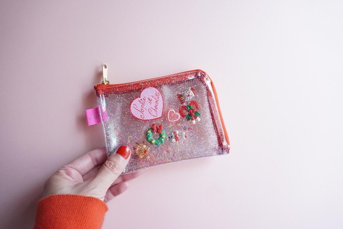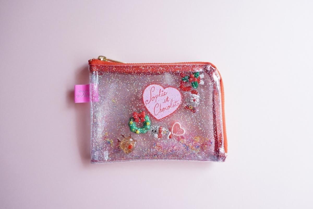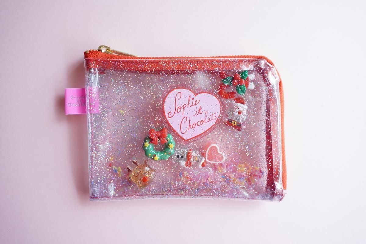 キラキラのPVCの中にオリジナルやキッチュ可愛いクリスマスパーツをギュッと閉じ込めたタイニーシェイクポーチ。