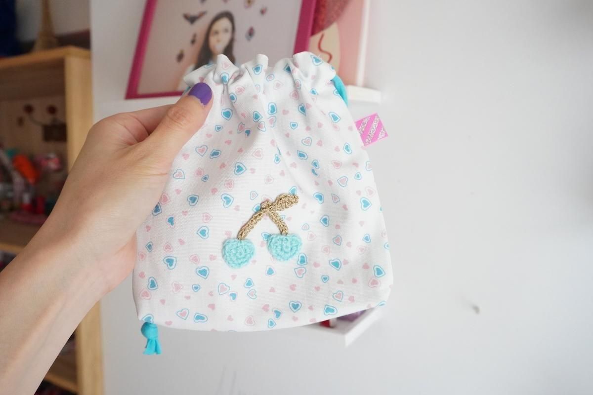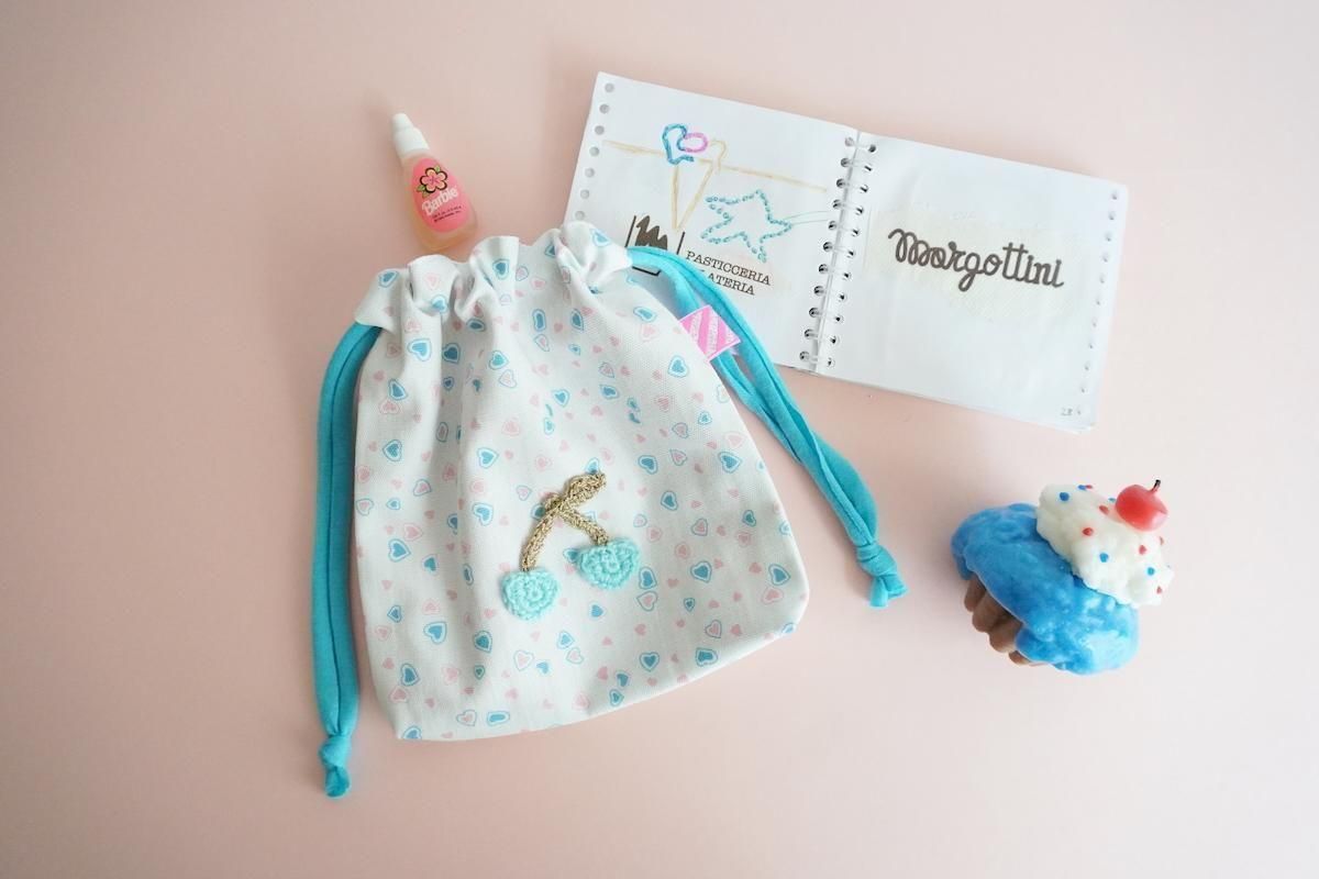 オリジナルのハート生地にチェリーワッペンがトッピングされた定番の巾着ポーチ。