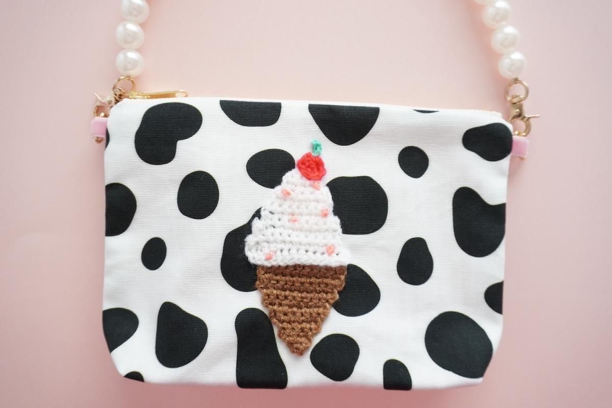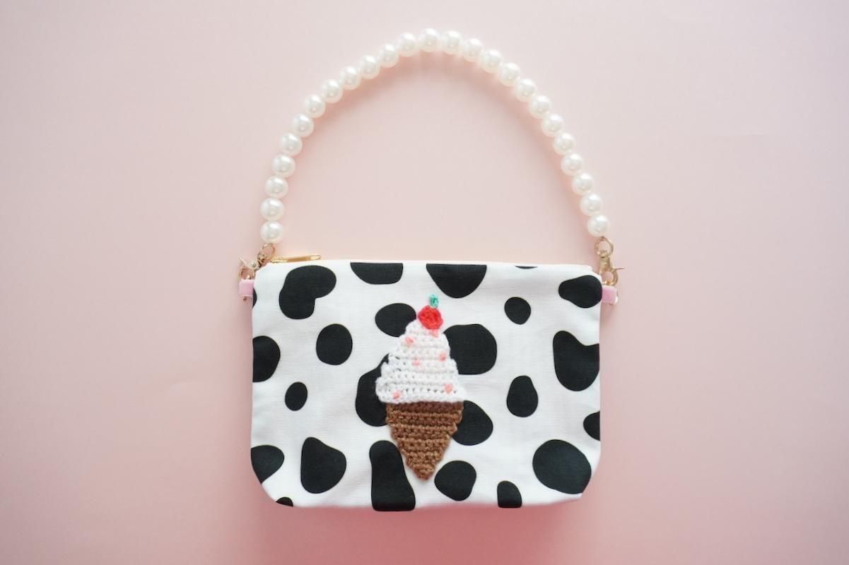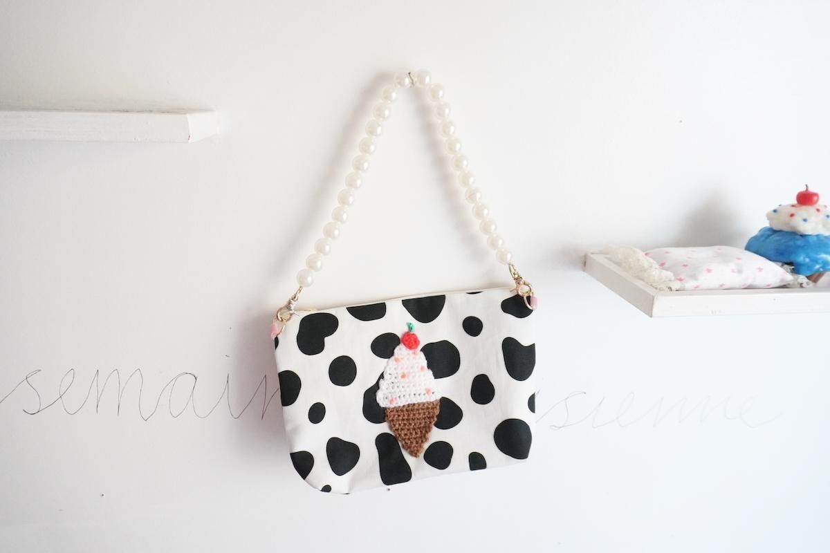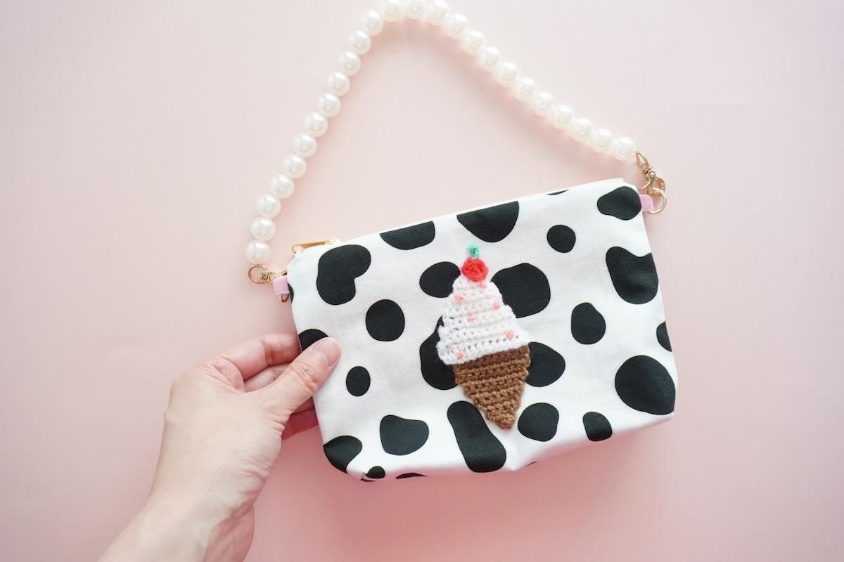 オリジナルファブリックで製作したポシェットに手編みのニットワッペンをプラス。