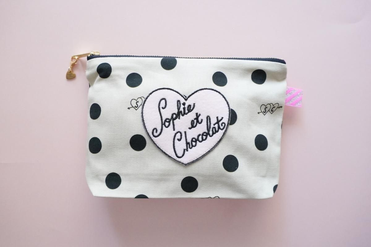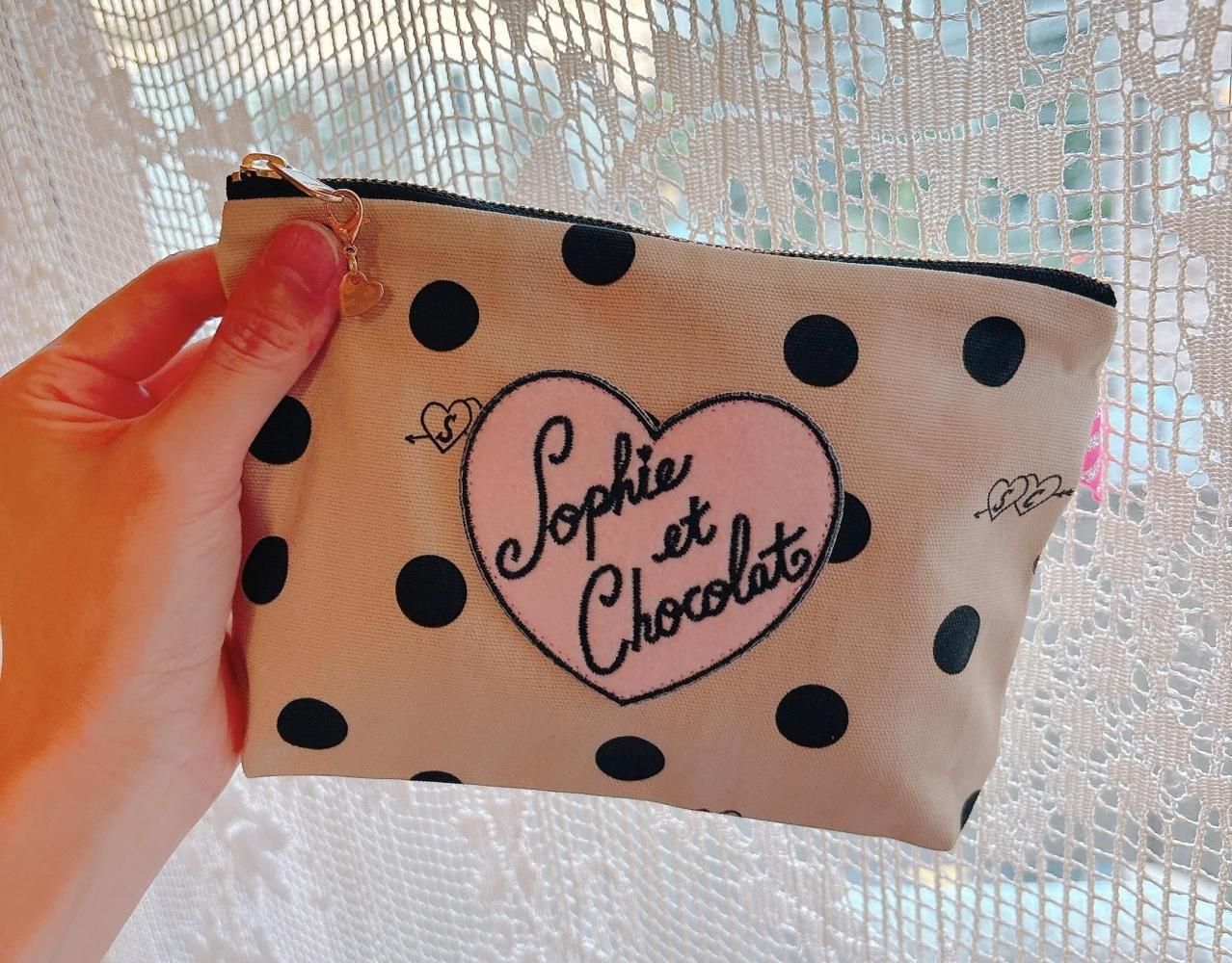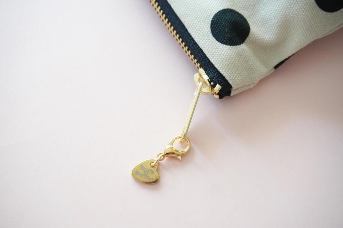 オリジナル素材を組み合わせたファスナーポーチ。Sophieのminiハートチャーム付きでお届けします。