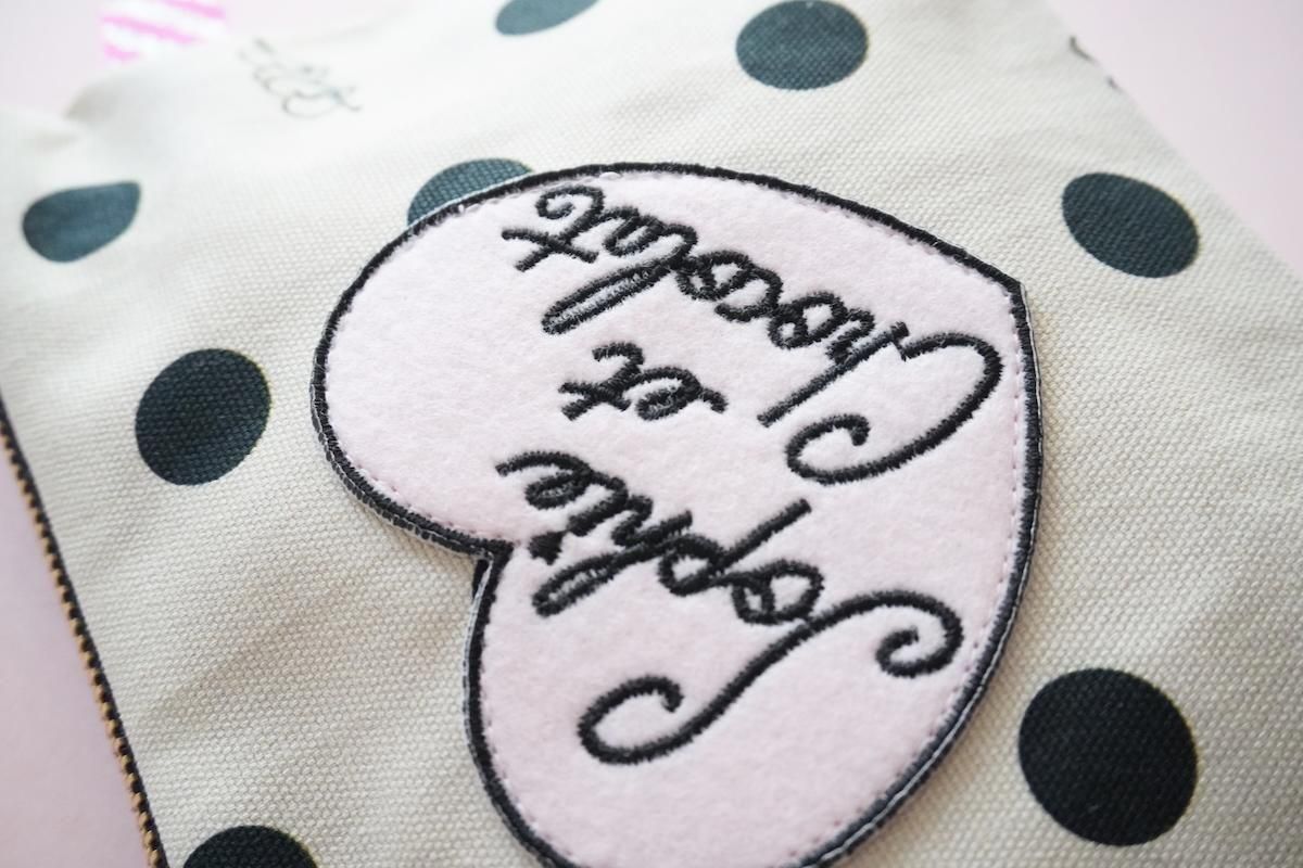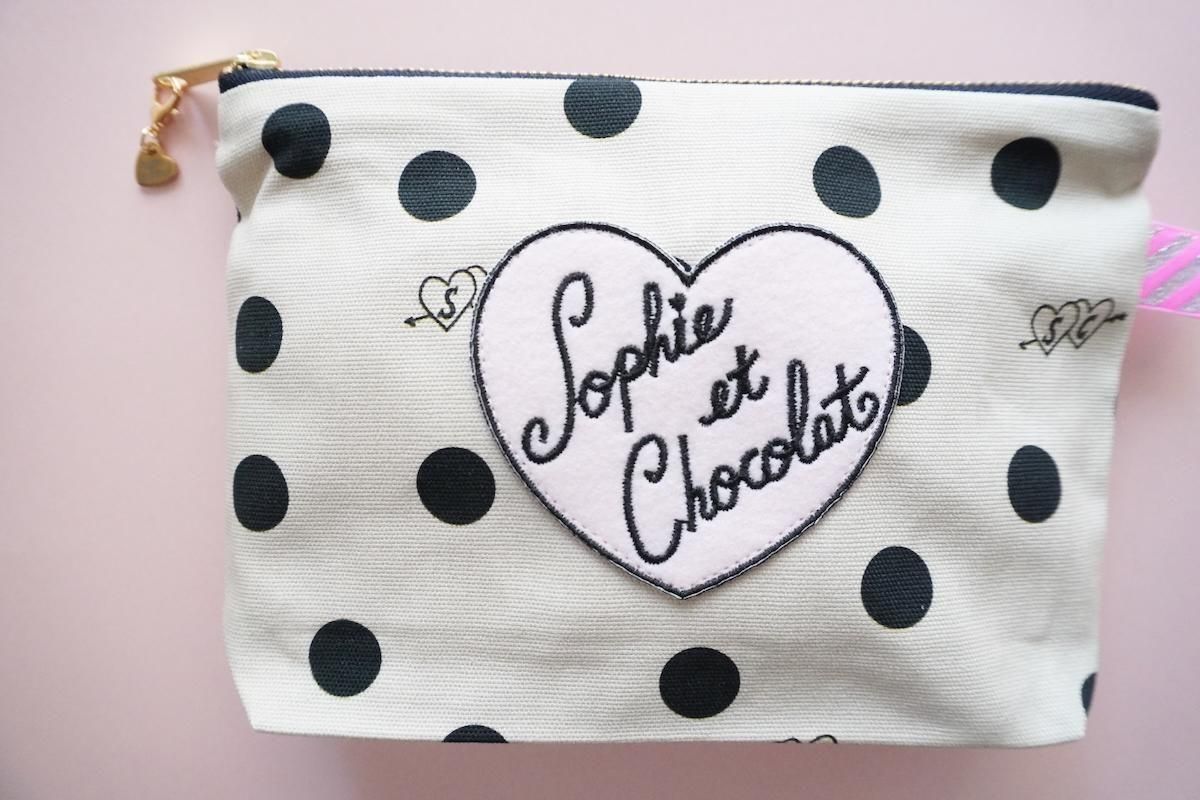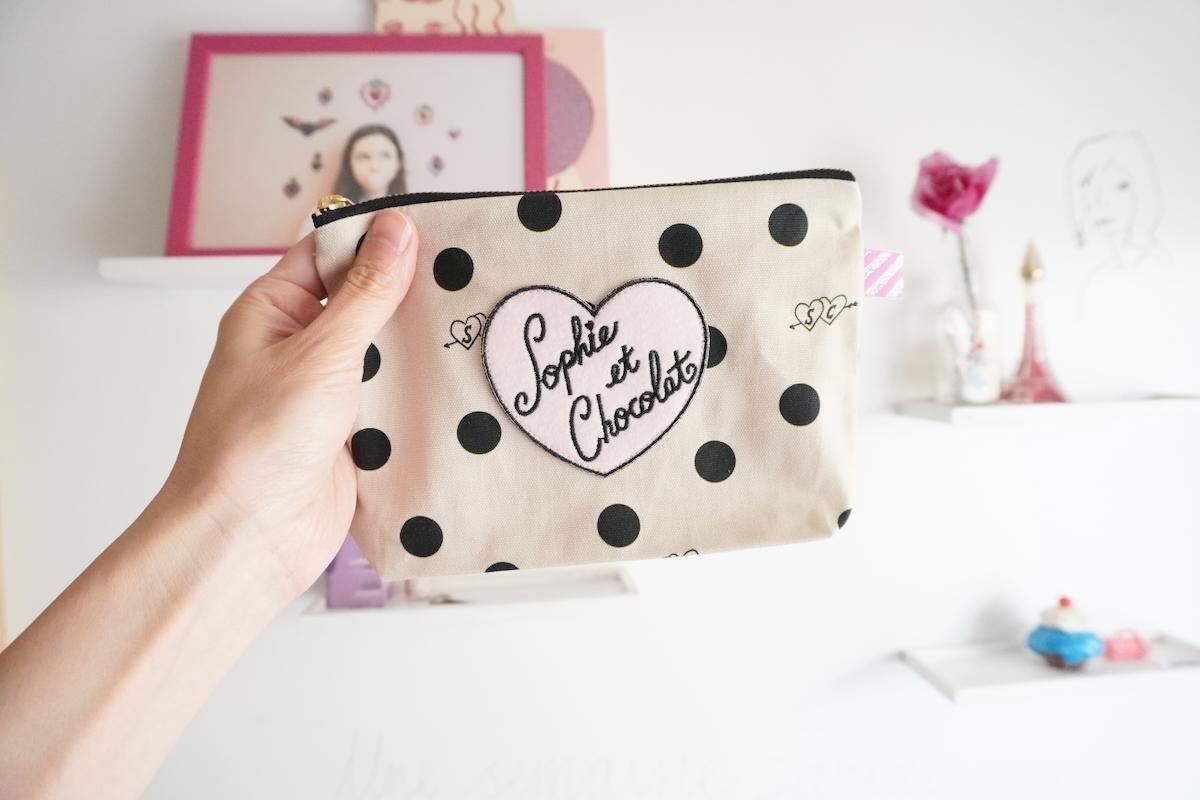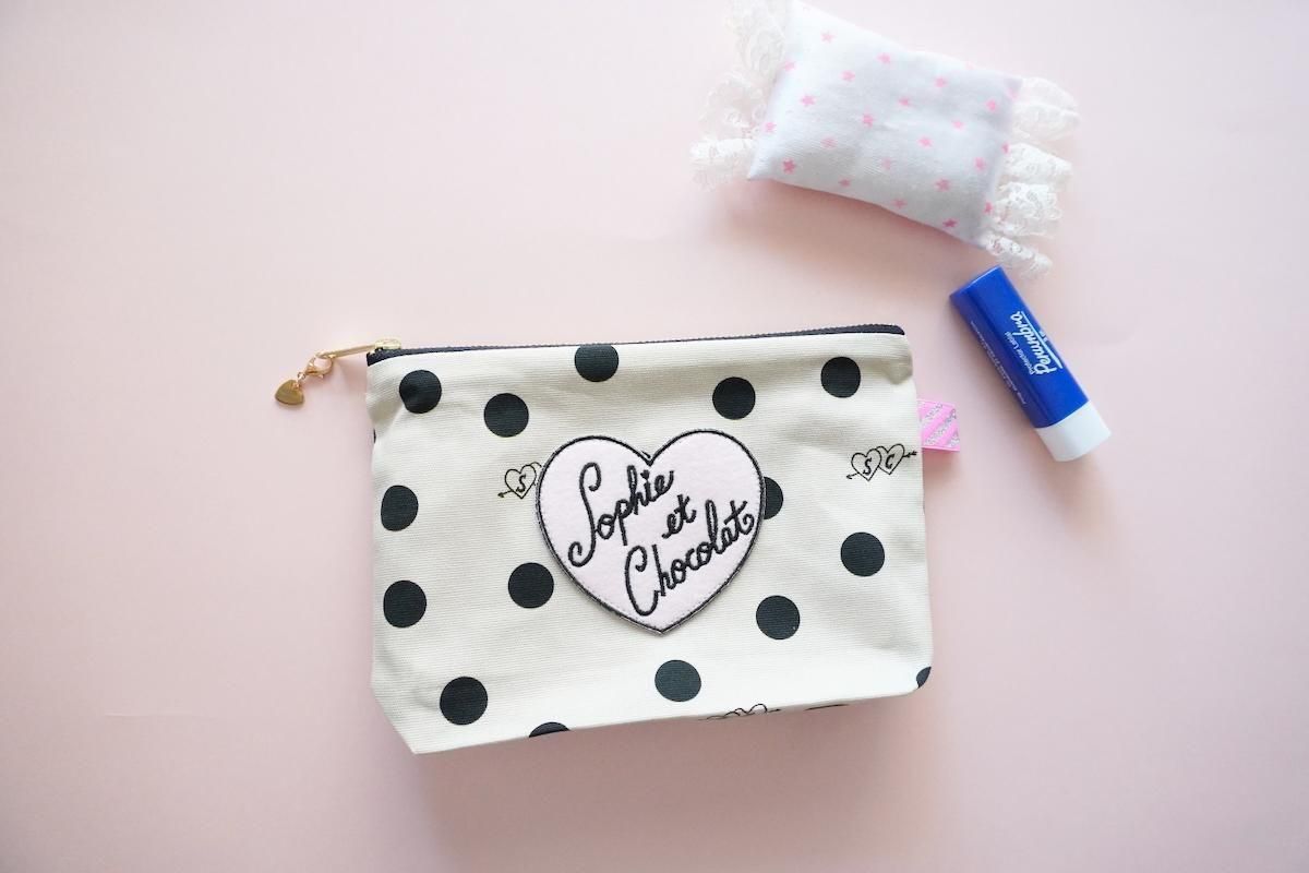 オリジナル素材を組み合わせたファスナーポーチ。Sophieのminiハートチャーム付きでお届けします。