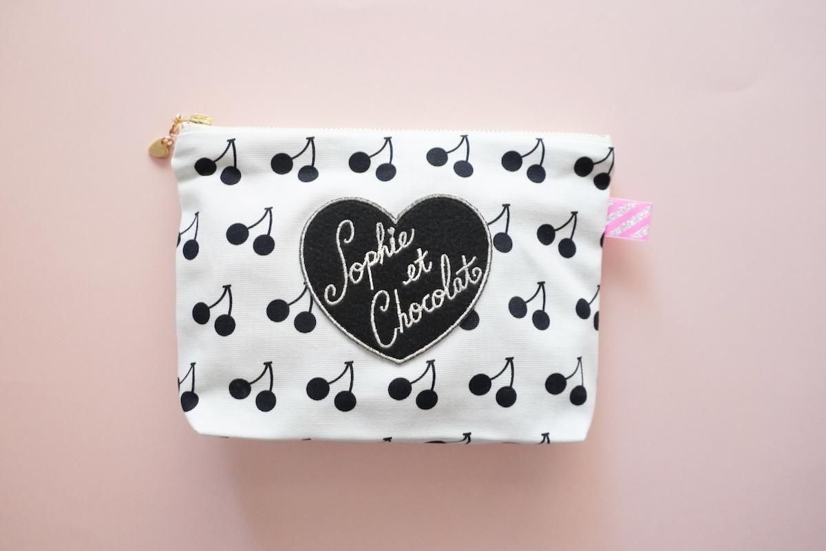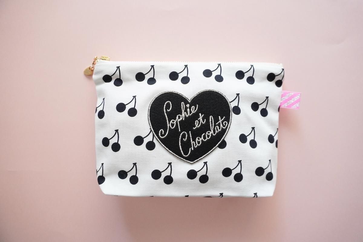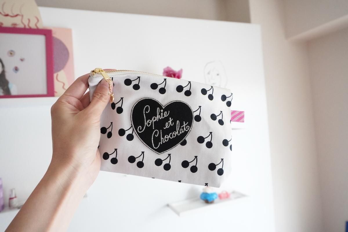 オリジナル素材を組み合わせたファスナーポーチ。Sophieのminiハートチャーム付きでお届けします。