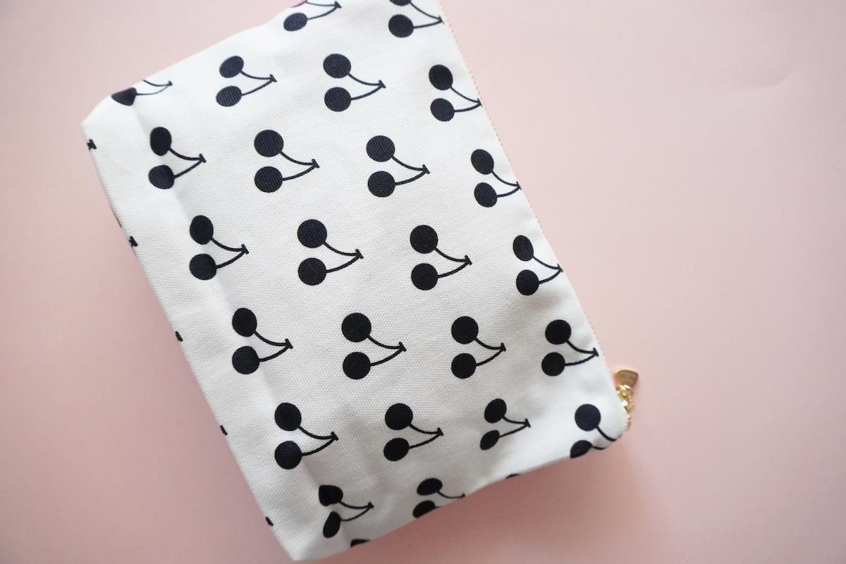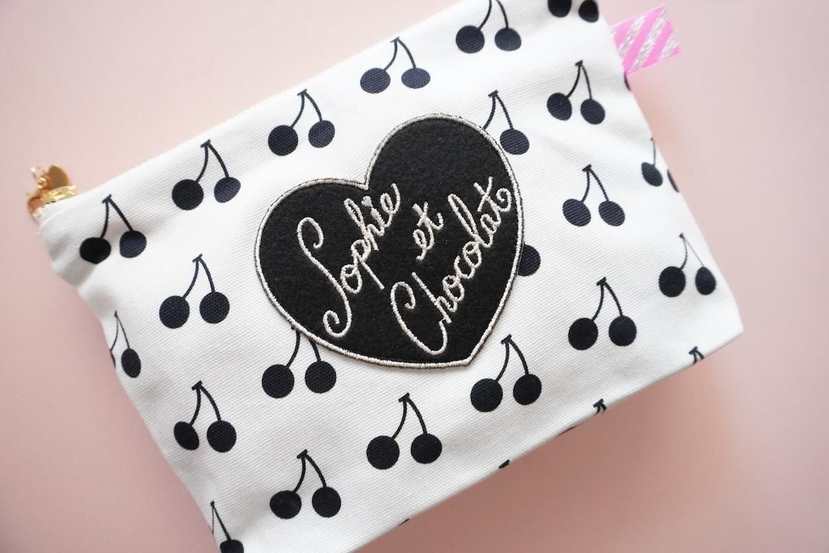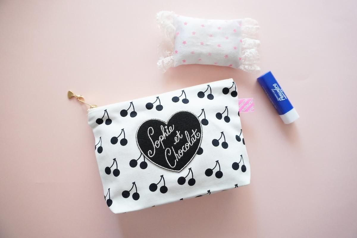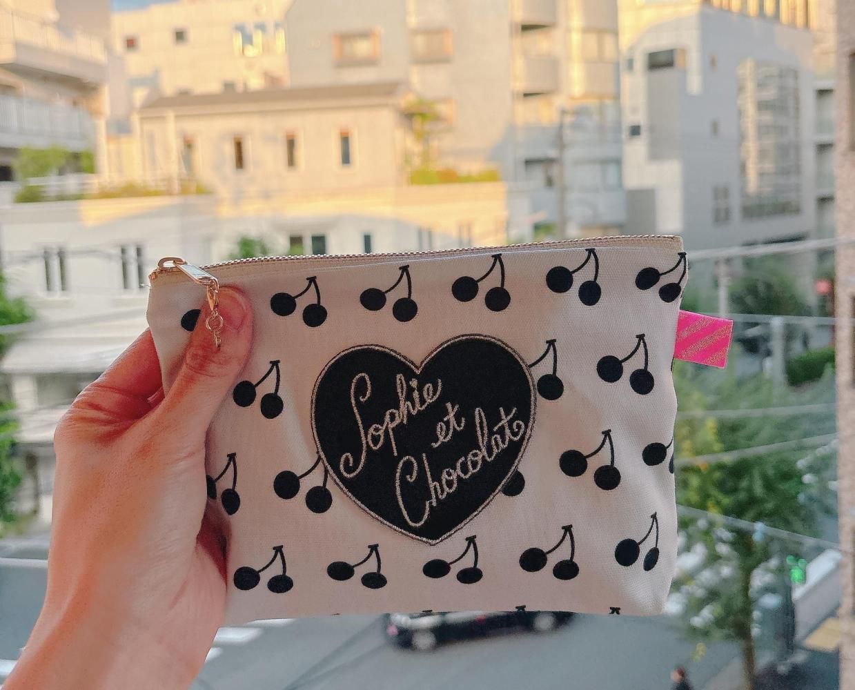 オリジナル素材を組み合わせたファスナーポーチ。Sophieのminiハートチャーム付きでお届けします。