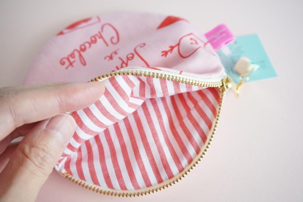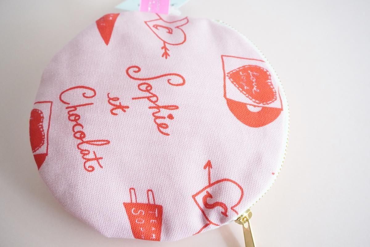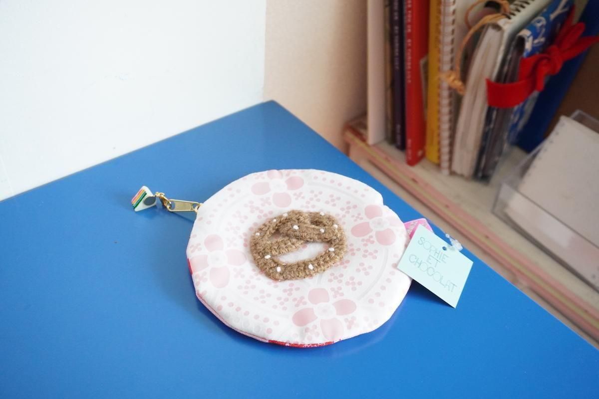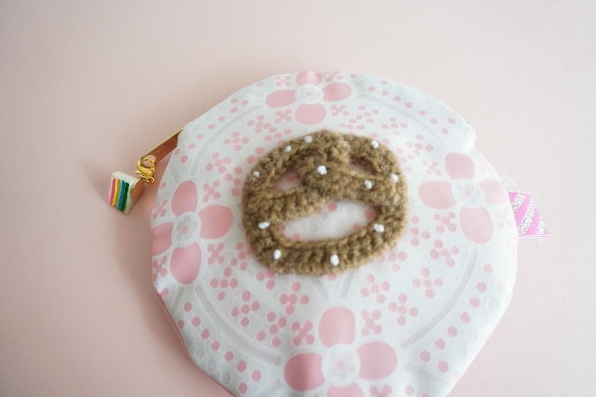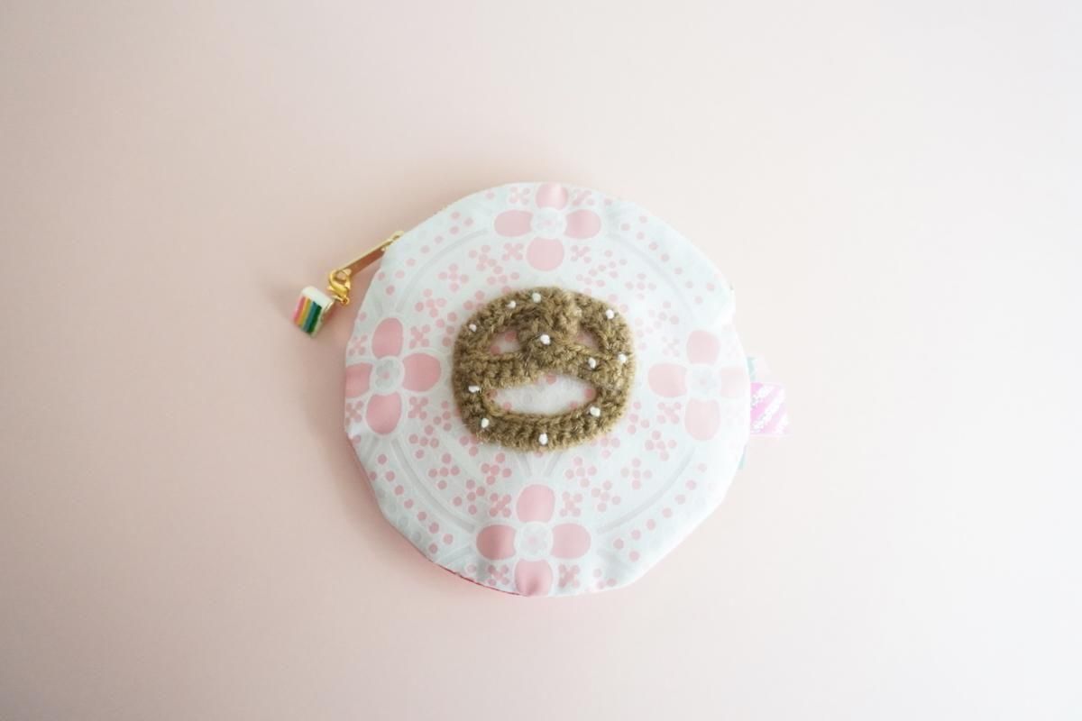 手編みのプレッツェルワッペンがトッピングされたサークルポーチ。