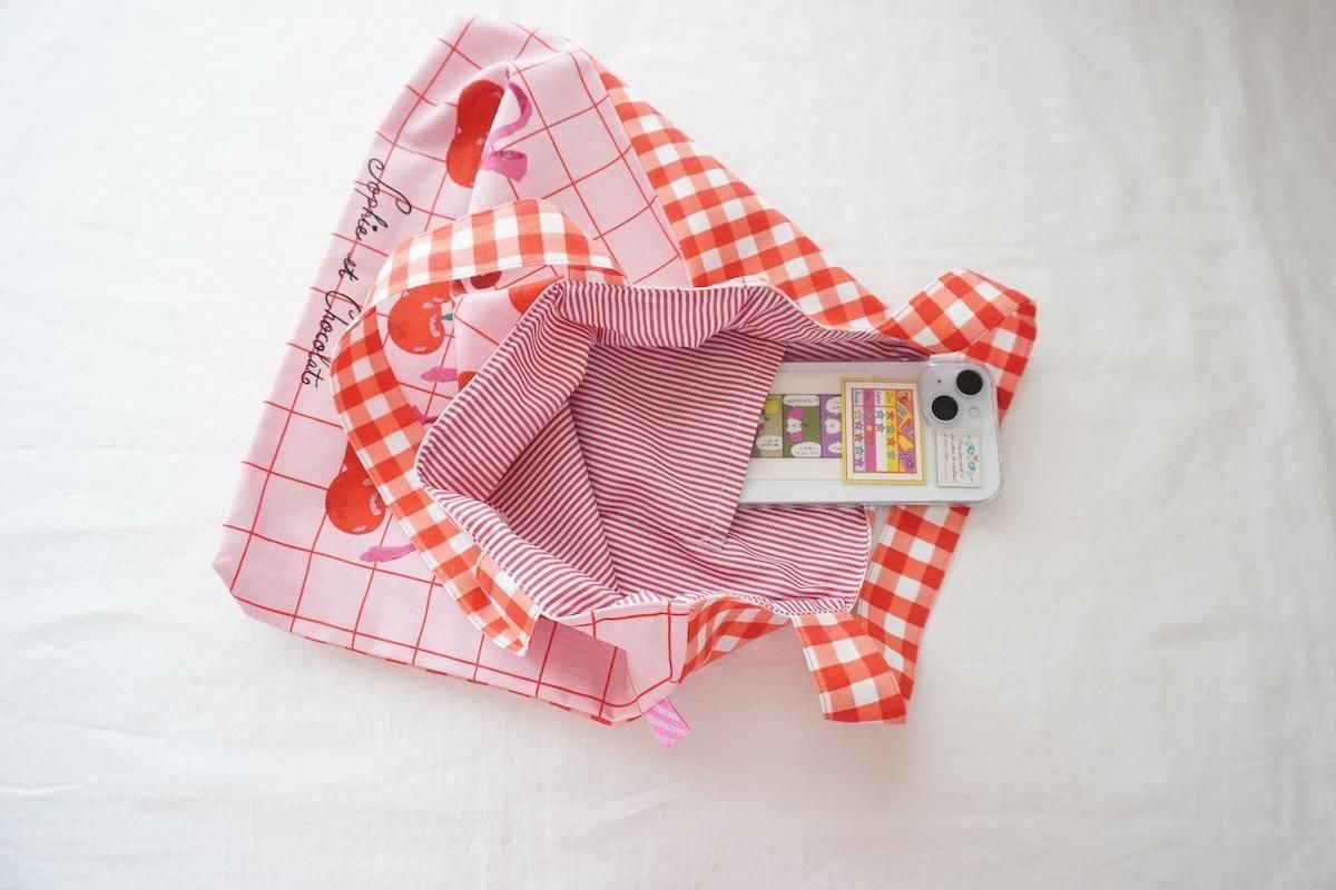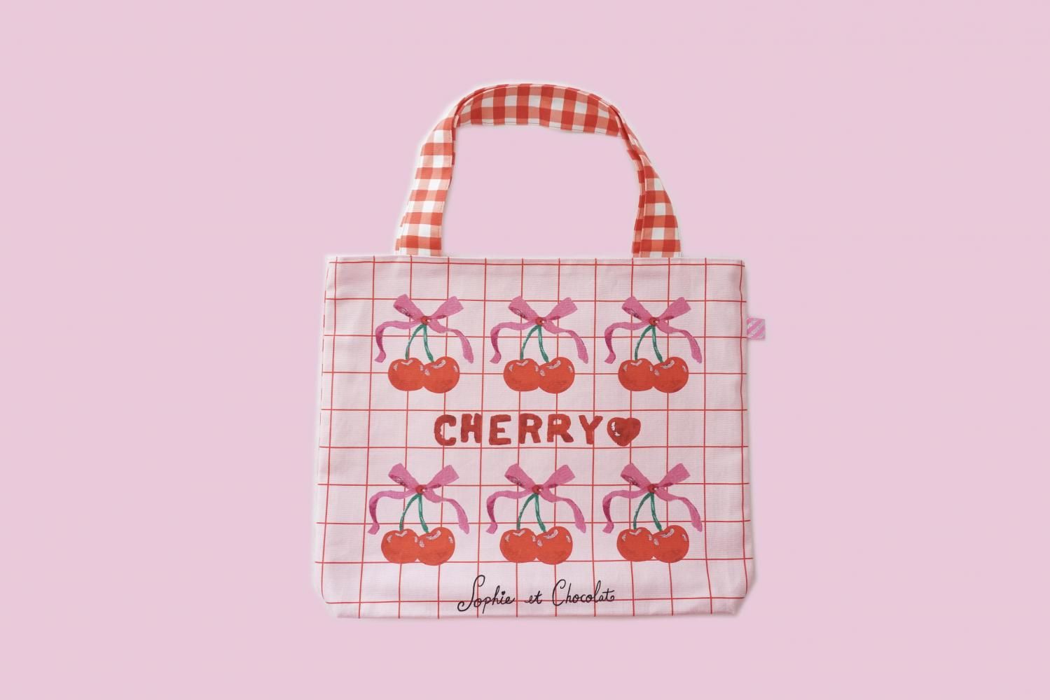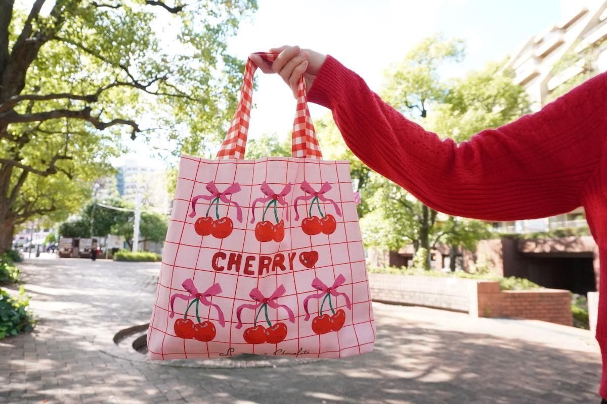 デザイナーが描いているキャンバス画のチェリーリボンがトートバッグになりました。