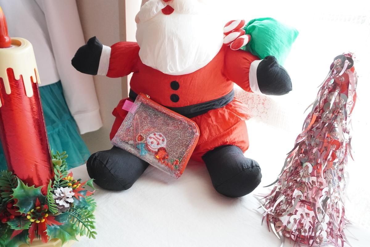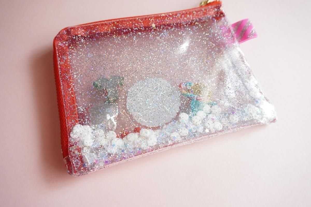 キラキラのPVCの中にオリジナルやキッチュ可愛いクリスマスパーツをギュッと閉じ込めたタイニーシェイクポーチ。
