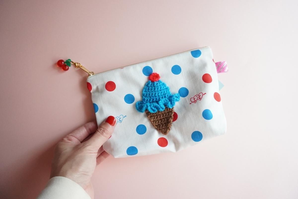 オリジナルファブリックに手編みのブルーアイスワッペンを組み合わせたファスナーポーチ。